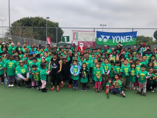 The stories and passion I heard in this episode inspired me to get more involved. Tennis Warehouse has been a supporter of the PBJTP for the past seven years, and I headed to the Harvard Park Tennis Courts in Los Angeles for their Holiday Event. The day consisted of so much love, kindness, gratitude, fun and, of course, tennis. Families and kids of all ages were invited to participate for a free day of tennis and instruction. They were also treated to lunch, tennis gear and many, many gifts. Sure, it sounds like a lovely day, but let me try to paint the picture a bit better.